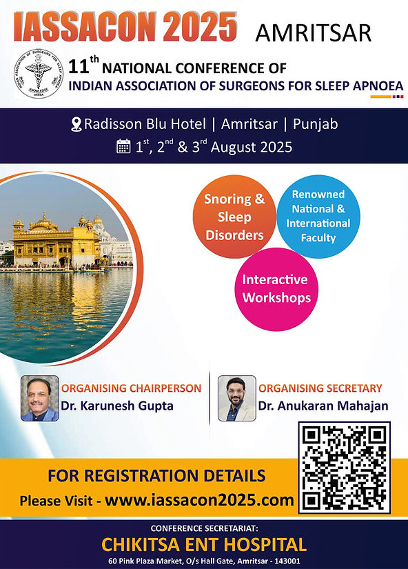It is both a privilege and a pleasure to extend a warm invitation to IASSACON 2025 (11th National Conference of Indian Association of Surgeons for Sleep Apnoea) scheduled to take place on 1st, 2nd and 3rd August, 2025.